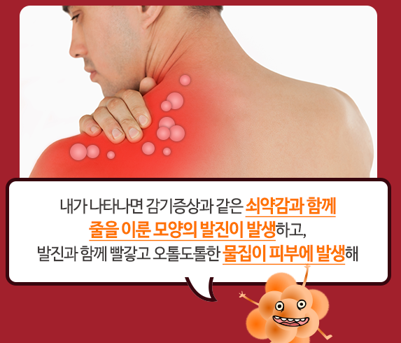 며칠 후 해당 부위에 붉은 반점이 생기고, 작은 물집이 형성됩니다. 이 물집은 시간이 지나면 터지고 딱지가 생깁니다.