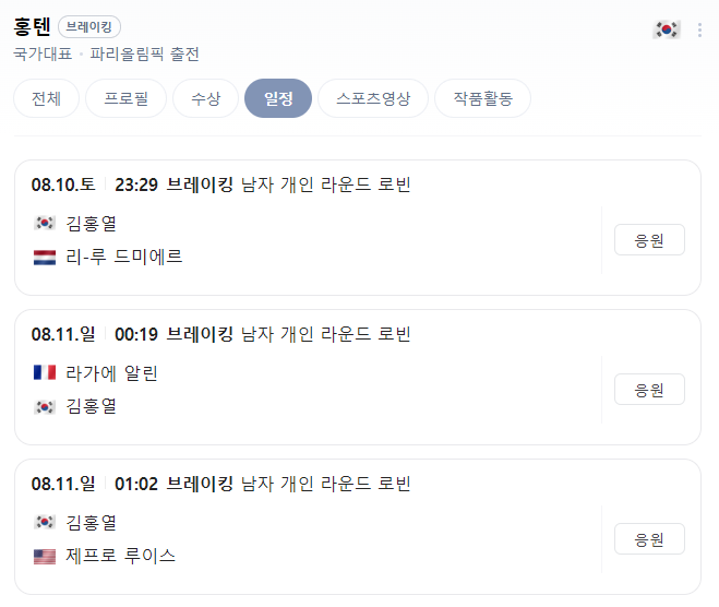 2024 파리올림픽 브레이킹 경기일정, 비보이 홍텐 선수의 경기일정을 안내 드립니다.