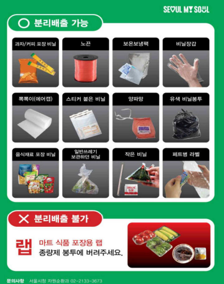 24년 7월부터 서울시에서 폐비닐 재활용 추진 사업을 시행합니다. 비닐을 일반 쓰레기(종량제봉투)로 버리다가는 과태료 30만원을 낼 수가 있습니다. 아래 쓰레기 분리수거 바뀐 내용 알아보셔서, 과태료 부과되지 않으시길 바라겠습니다.